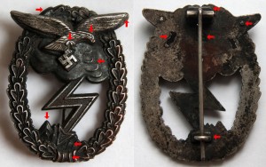 • Posuzovaný odznak má grafické odchylky oproti originálům (viz následující fotky, na nichž jsou některé odchylky označeny šipkami):